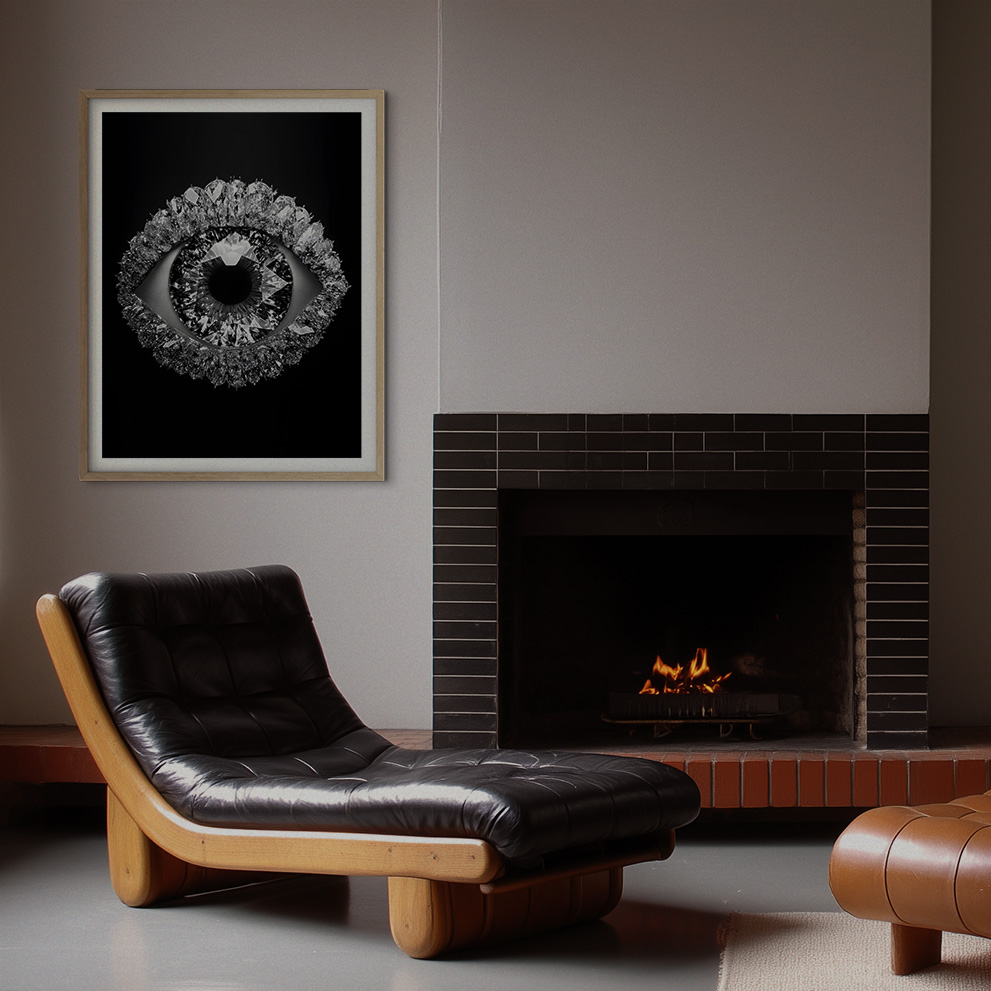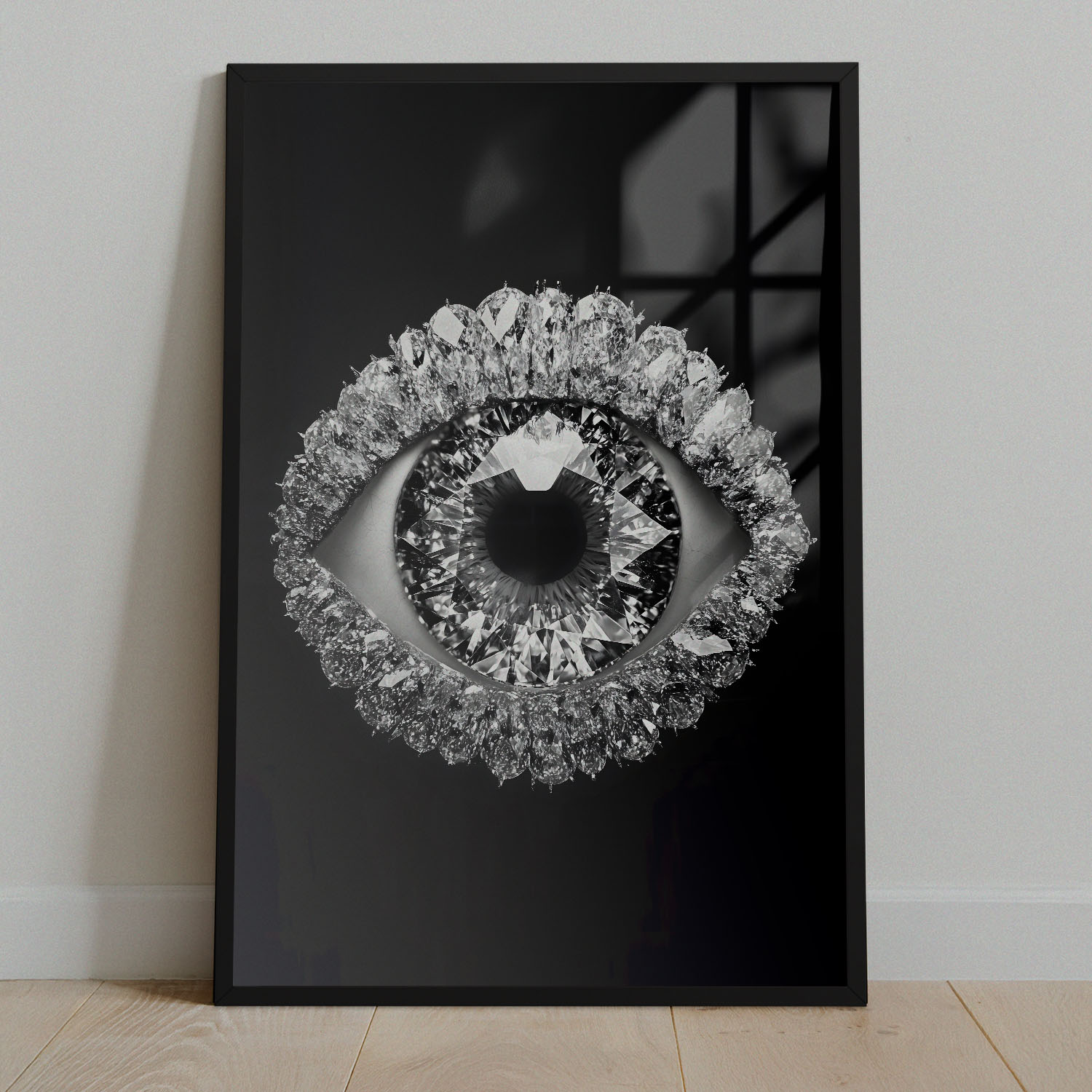 Against a black field, the eye appears as if set in stone and light. Diamond like facets in black and white create a jewel effect that reads as minimal from afar and richly detailed up close. The mood is monochrome and striking, with a photoreal presence that feels more like an object than an illustration, almost as if it belongs in a glass case and somehow ended up on your wall.
