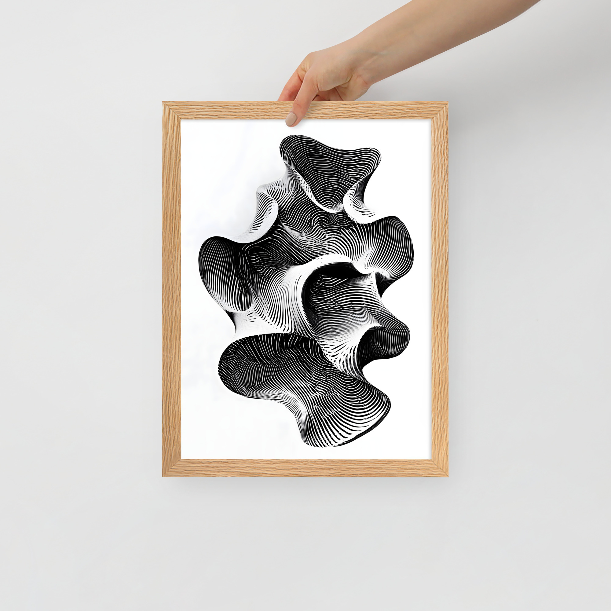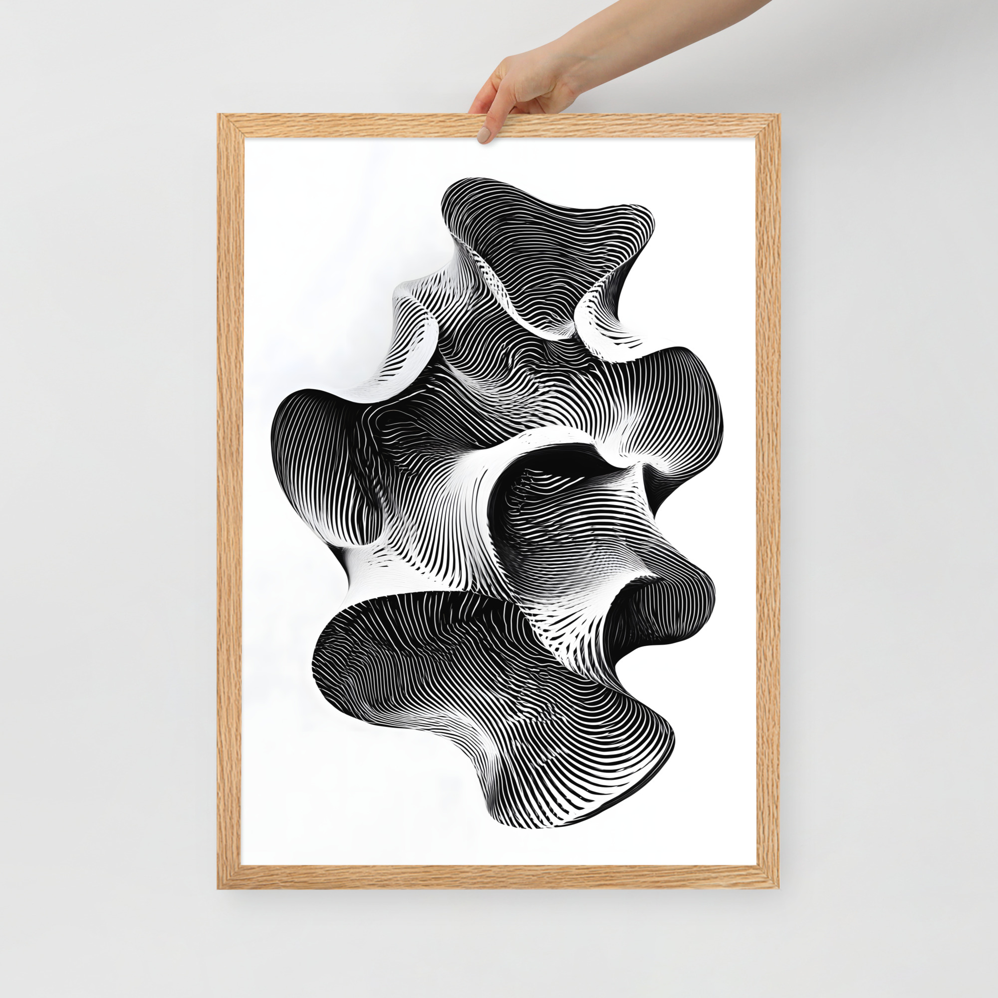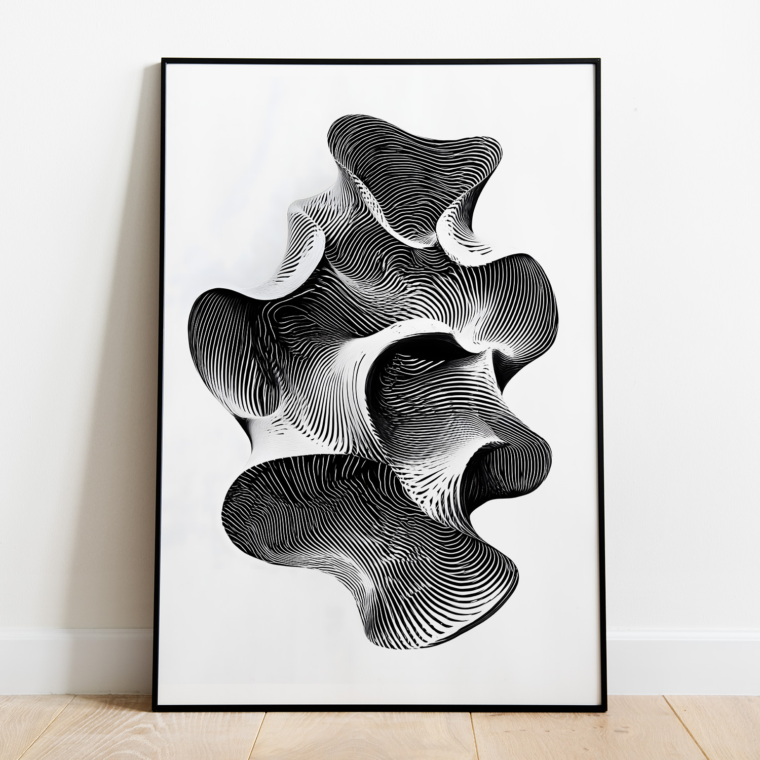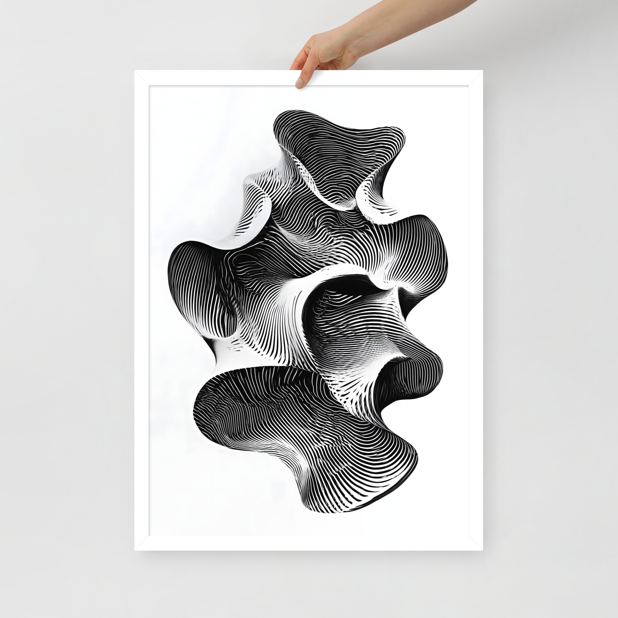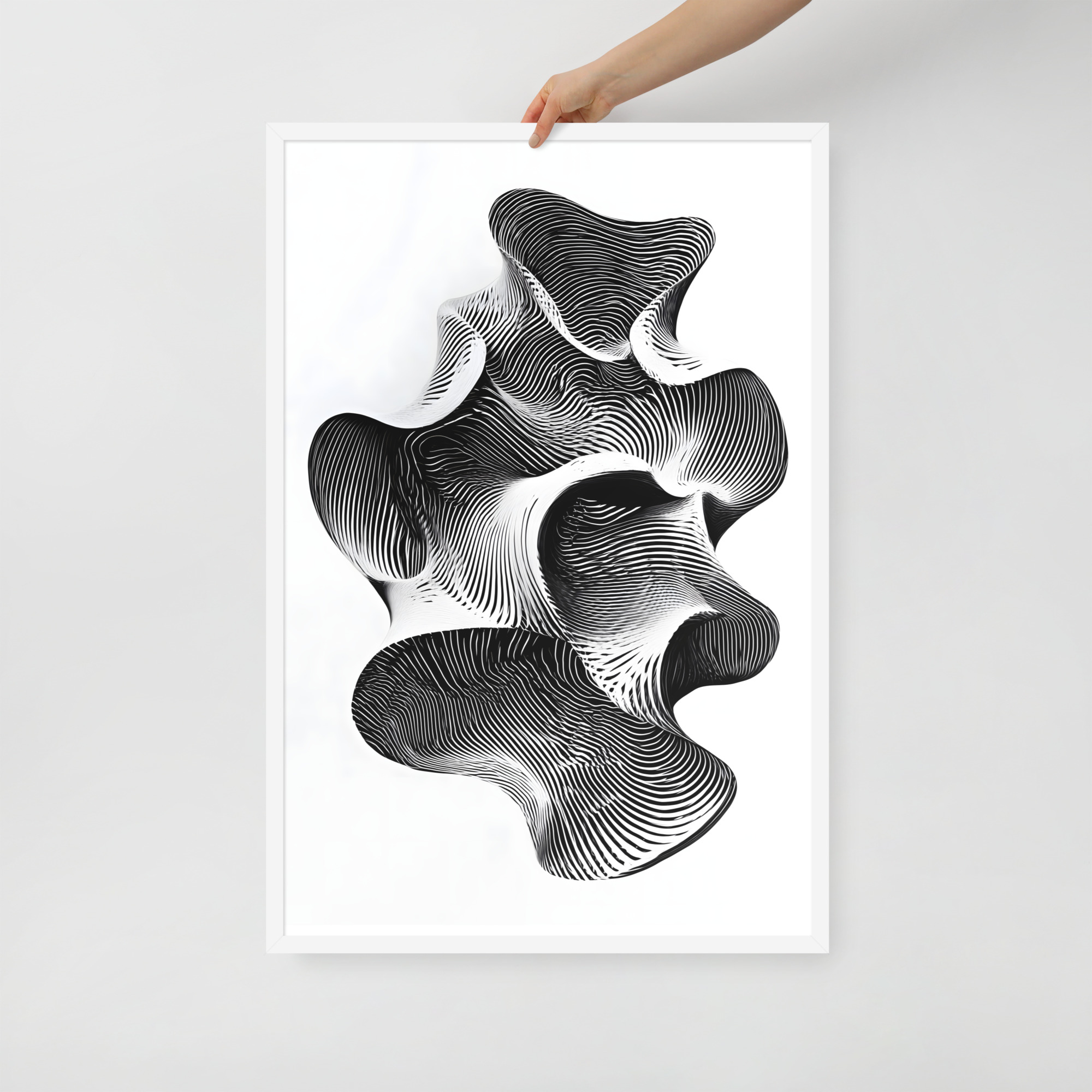The design is crisp black and white, built from tight contour lines that fold into an abstract form, like a topographic map decided to become a sculpture. Your gaze naturally travels the curves, gets pulled into pockets of shadow, then resurfaces somewhere else. It is oddly grounding for something that looks like it could be the shape of a thought mid sentence, which is probably the point. If your brain tends to lock onto one story and call it final, this piece gently suggests there might be a few more tabs open.