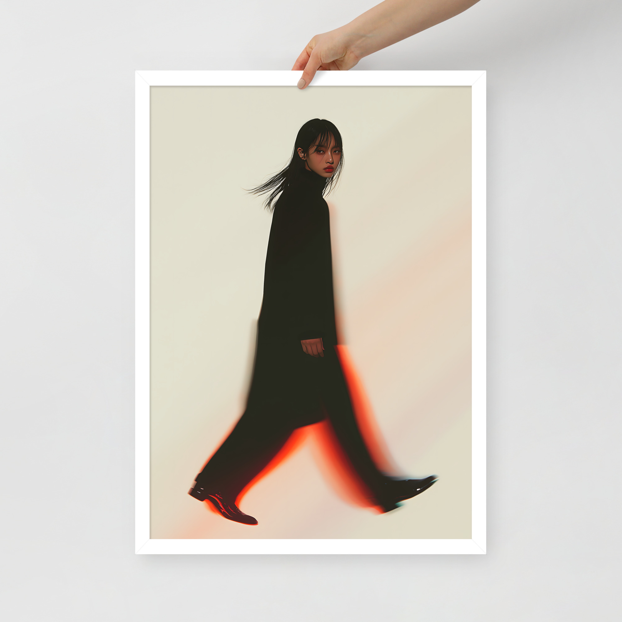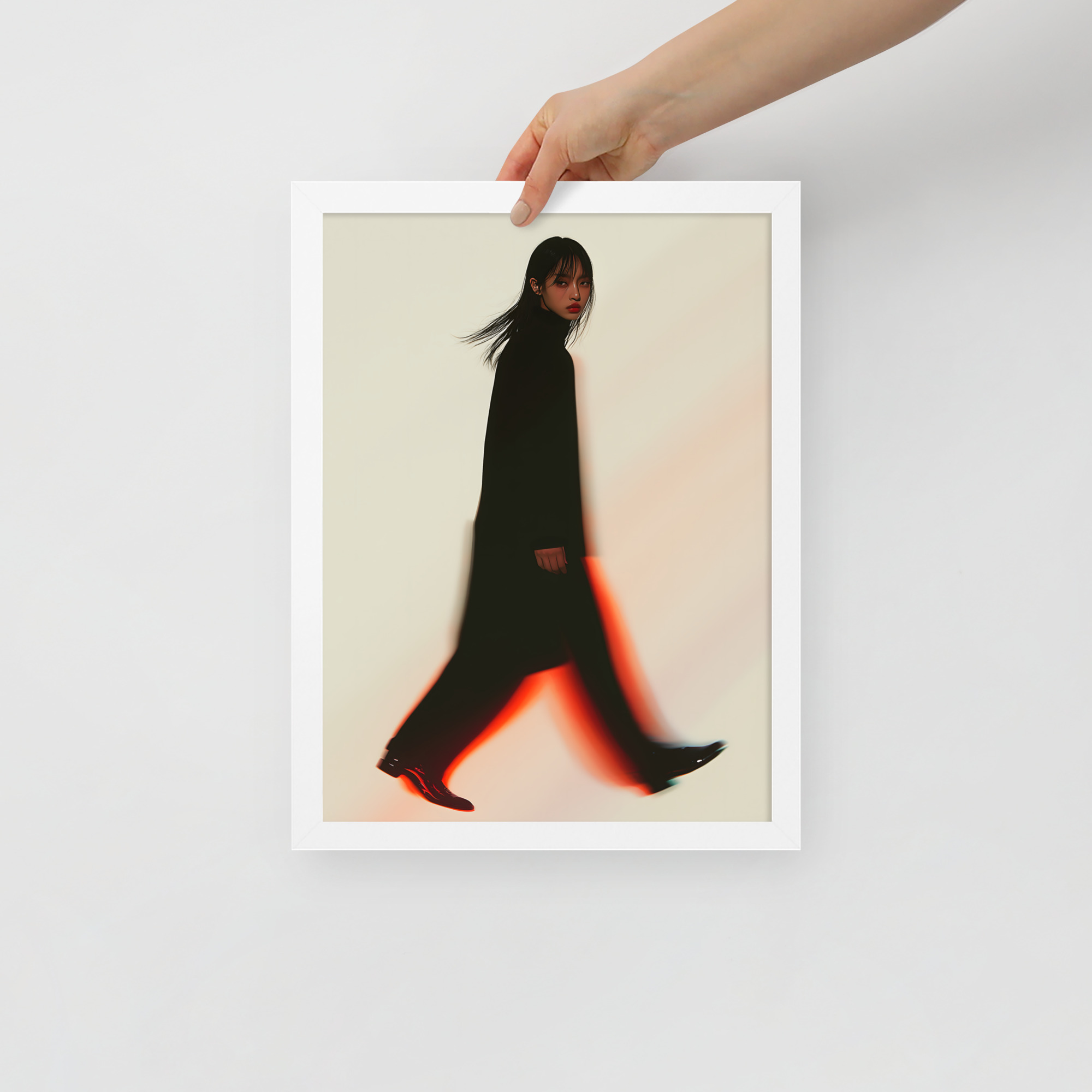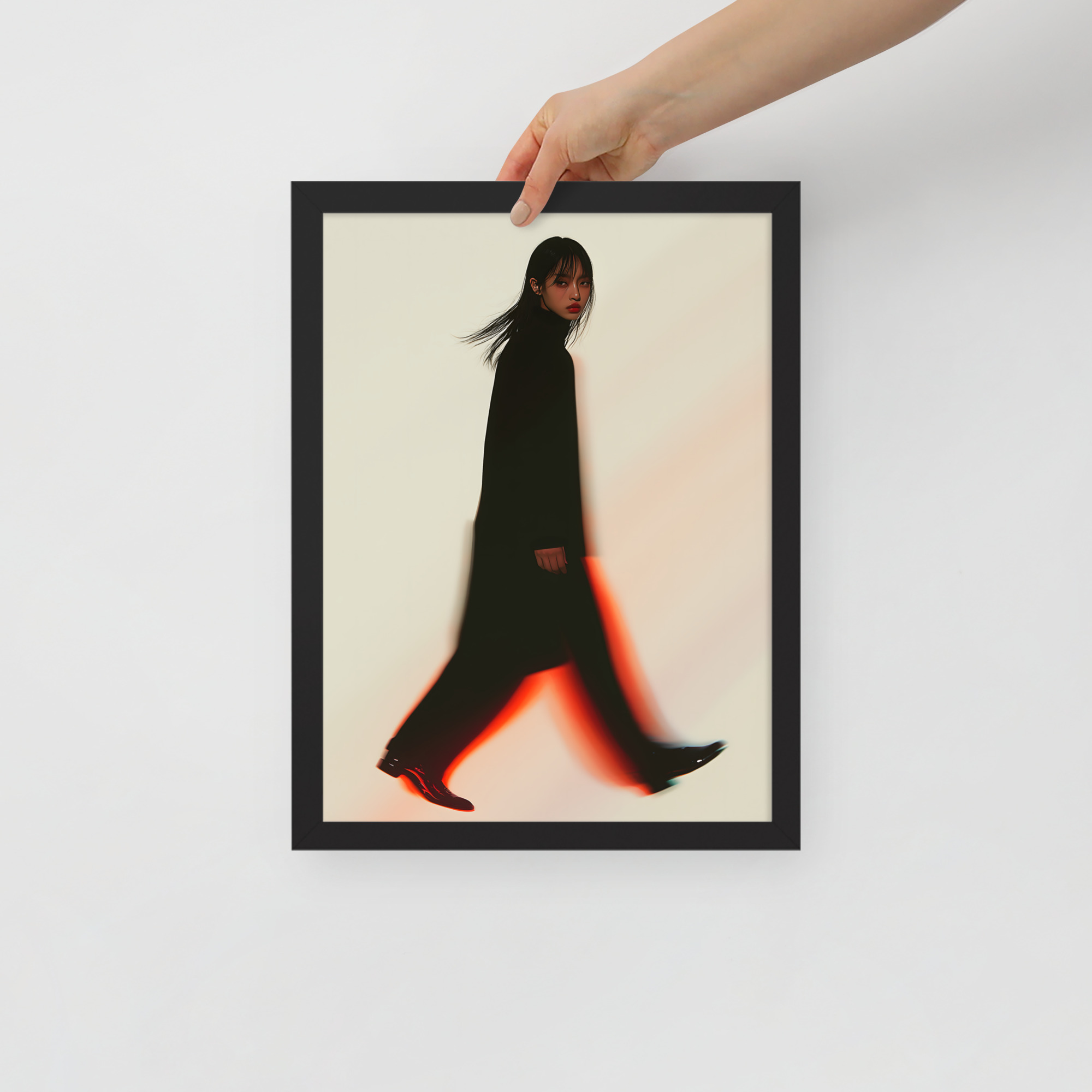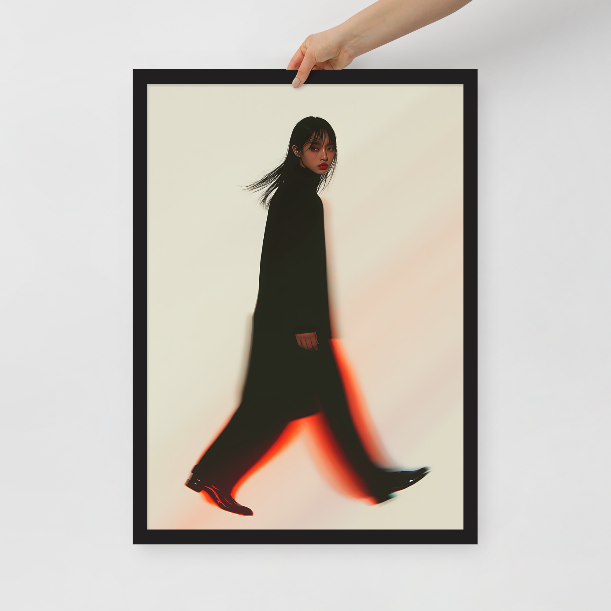 Action framed print is a portrait about getting out of your head and back into your body. A figure moves across an open, pale field in a black silhouette, with a warm red orange blur trailing the legs like momentum made visible. It is minimalistic, but the message is clear: begin.