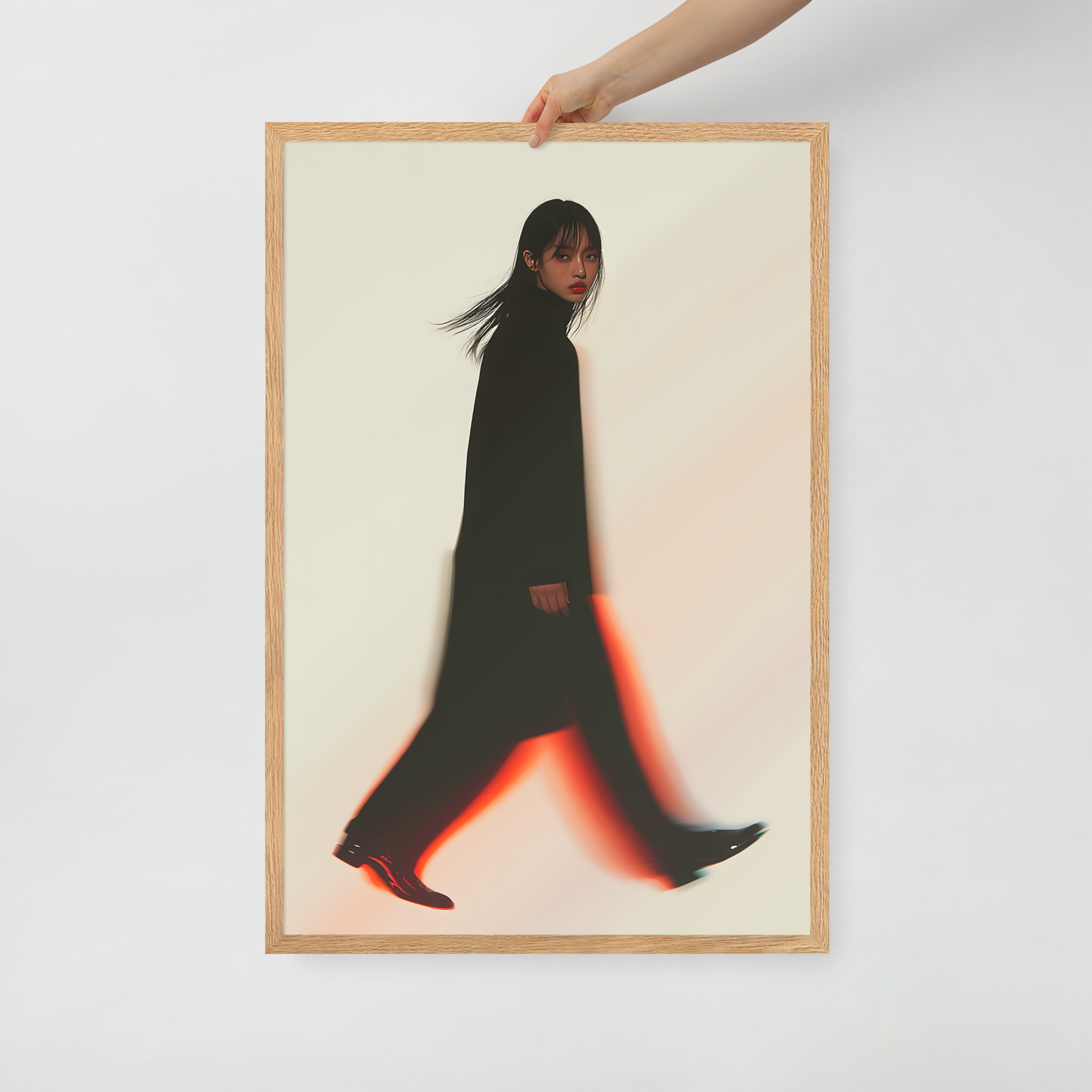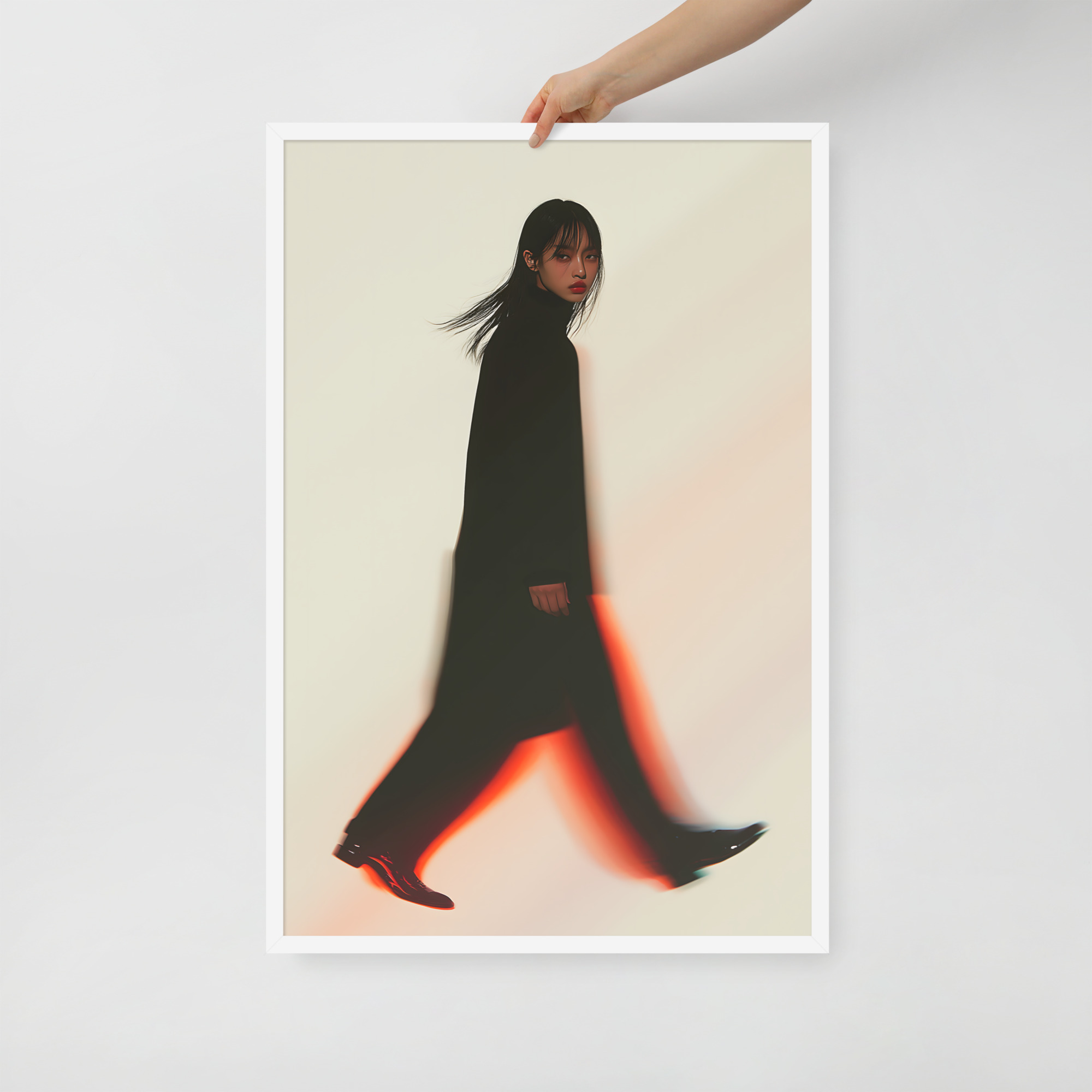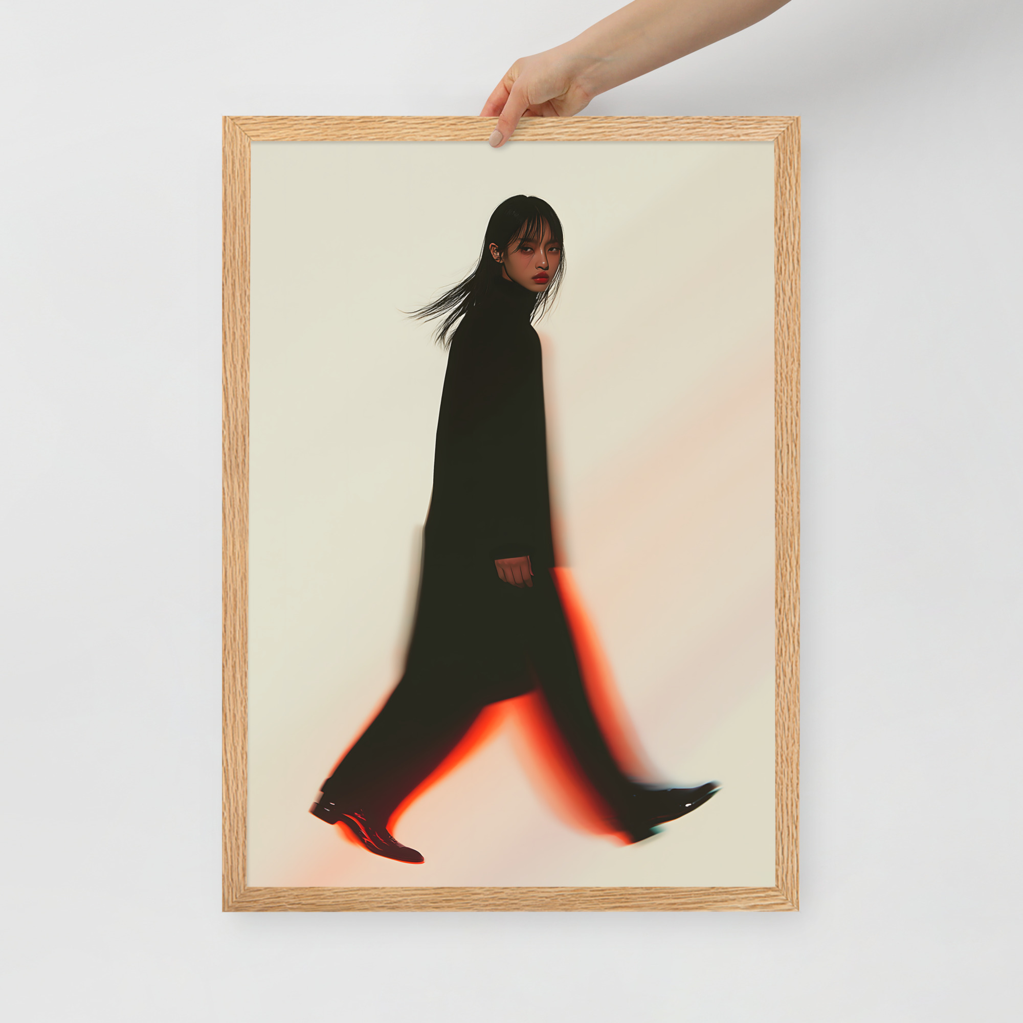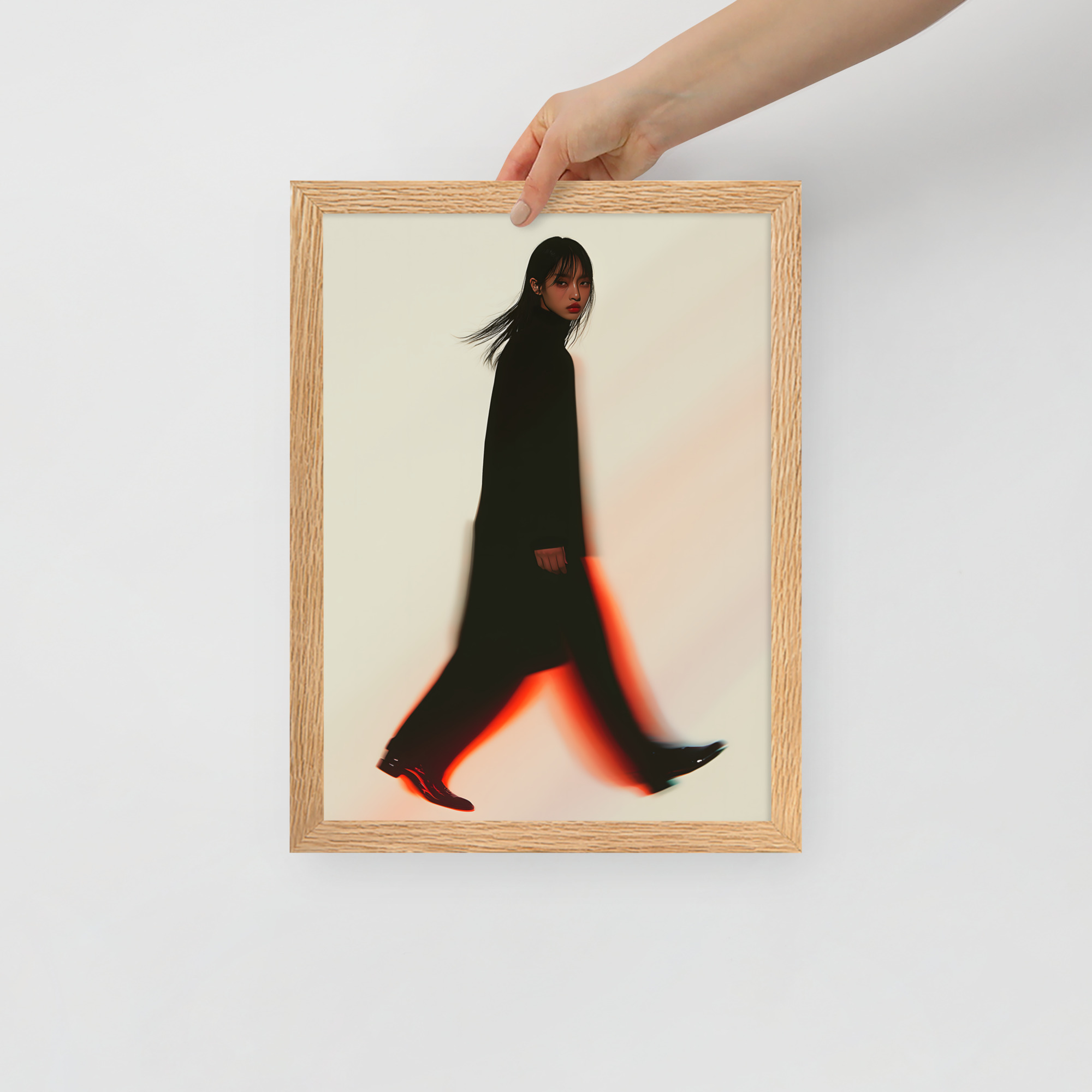 Action framed print is a portrait about getting out of your head and back into your body. A figure moves across an open, pale field in a black silhouette, with a warm red orange blur trailing the legs like momentum made visible. It is minimalistic, but the message is clear: begin.