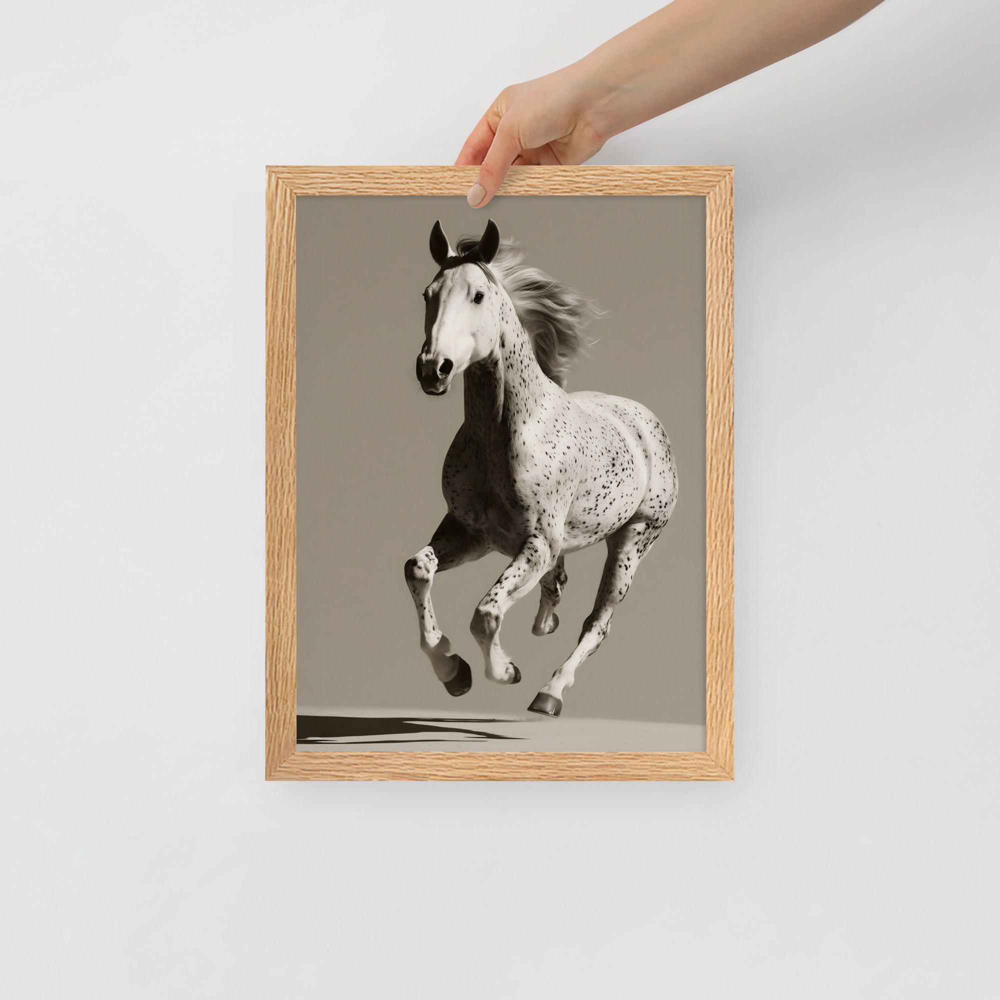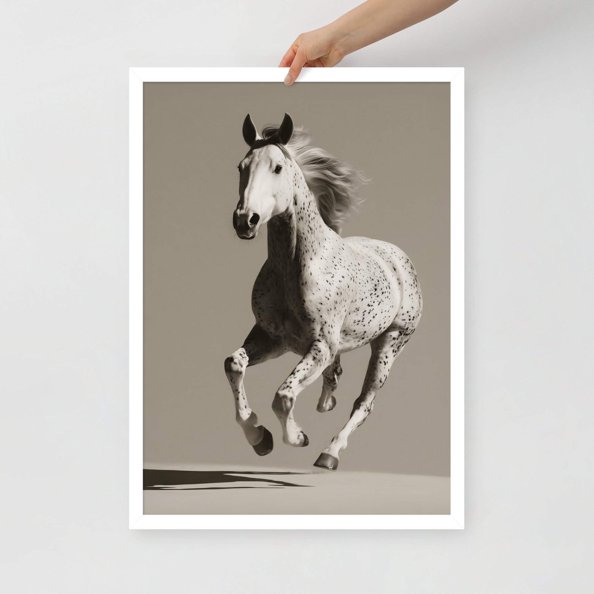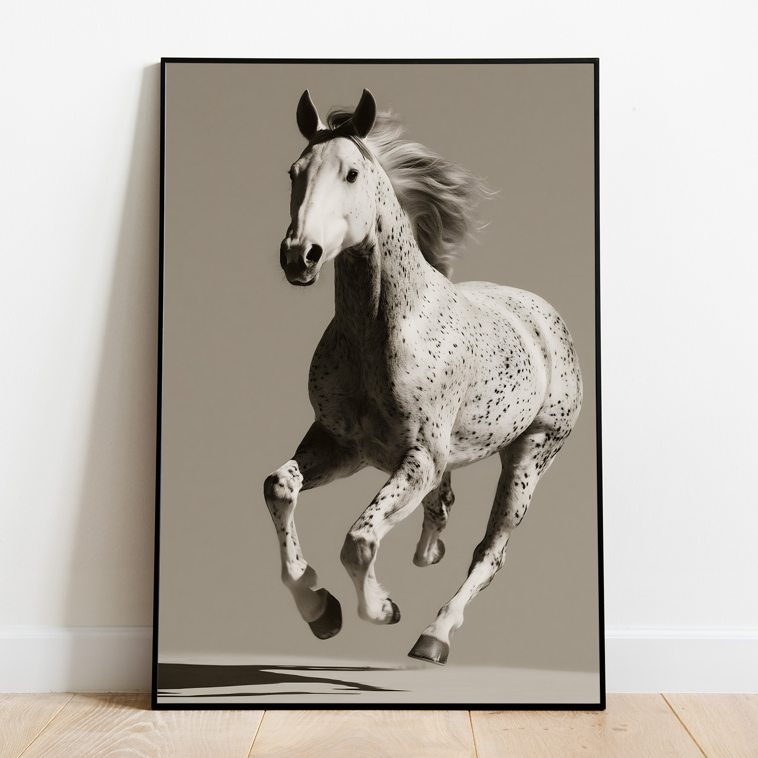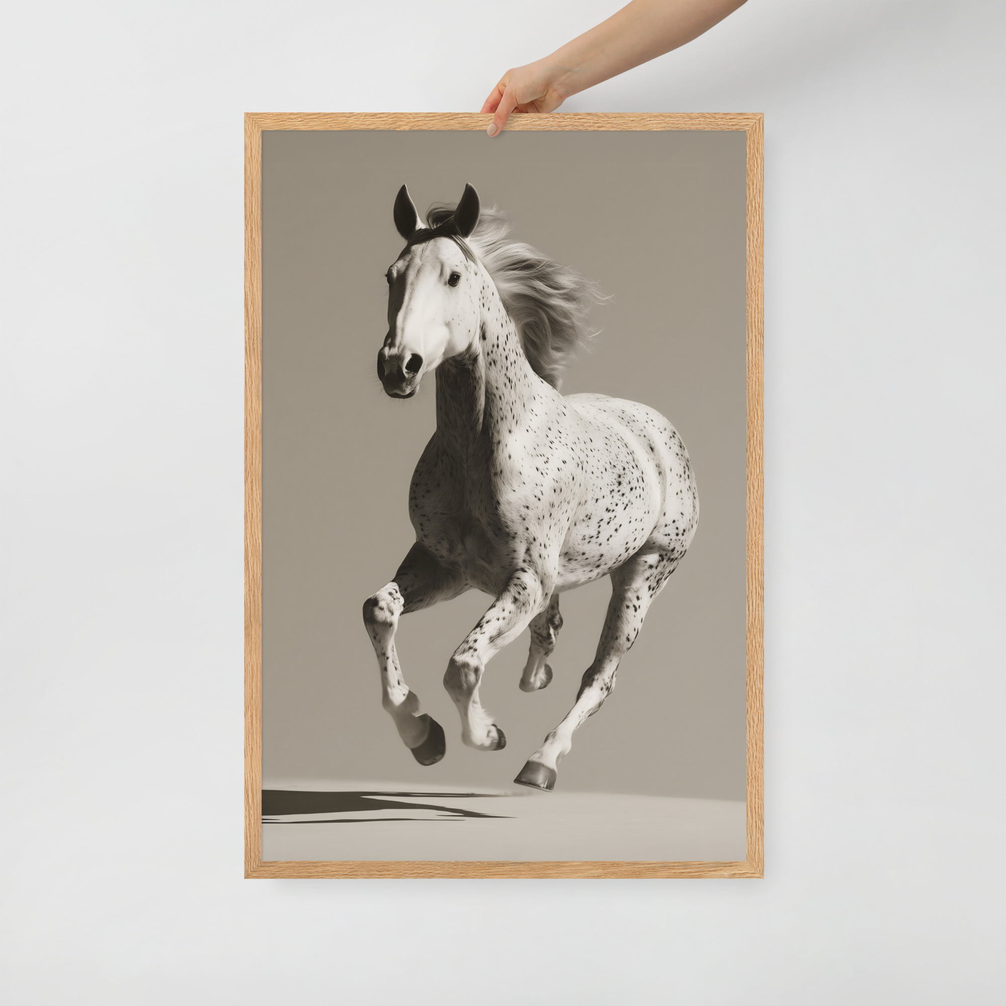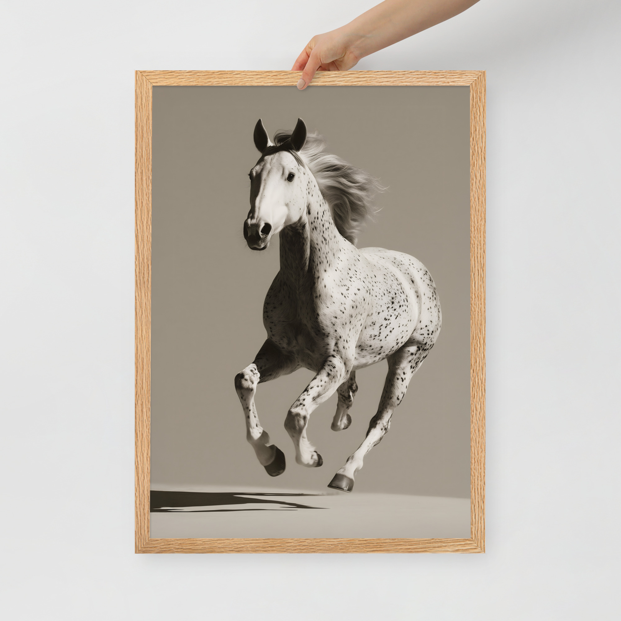 Galloping Horse framed print captures the kind of momentum you can feel in your own body. A horse, suspended mid stride, moves with clean intensity and effortless control, as if the next second already belongs to it.