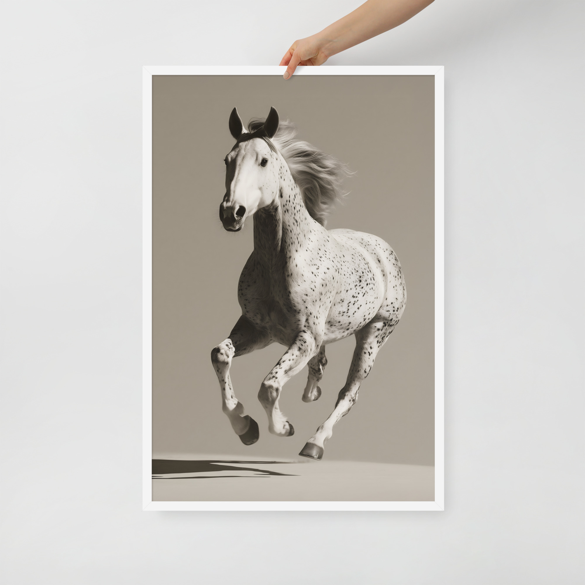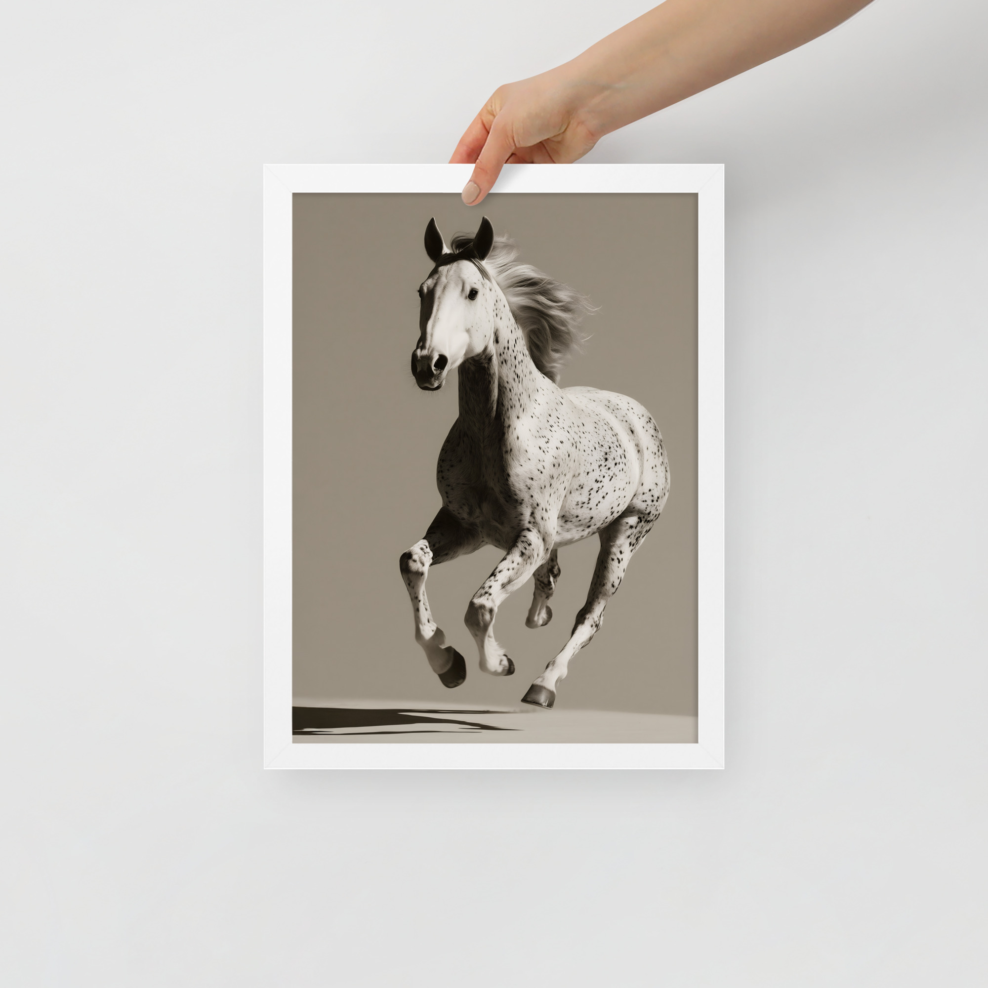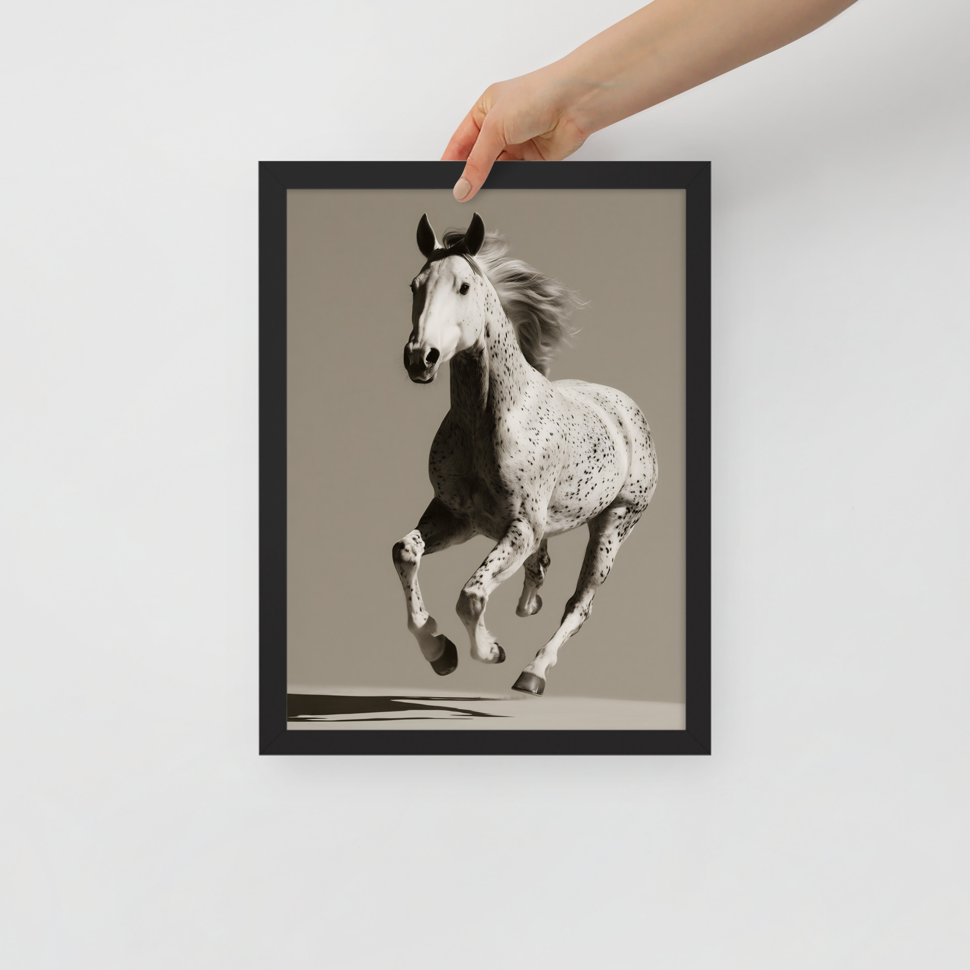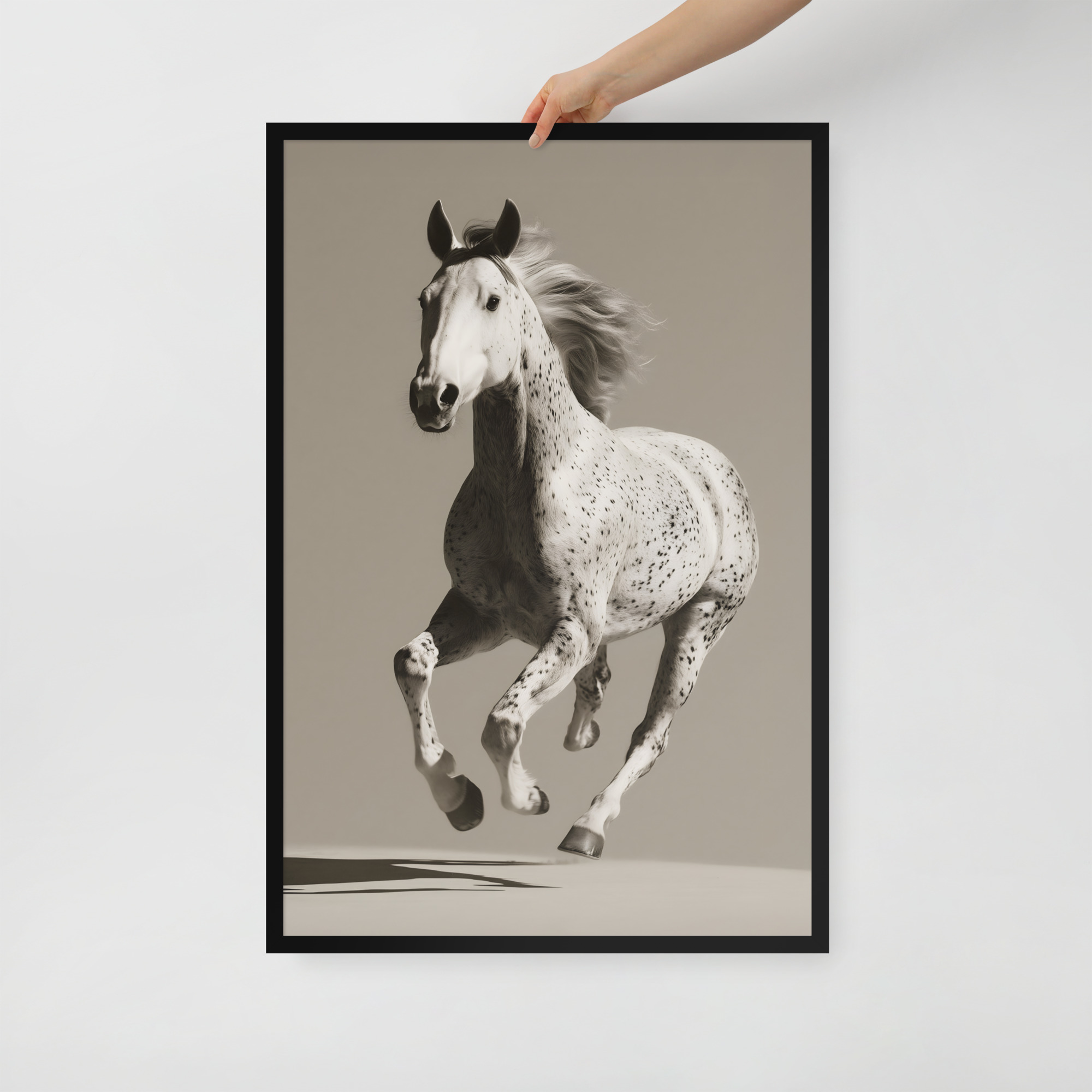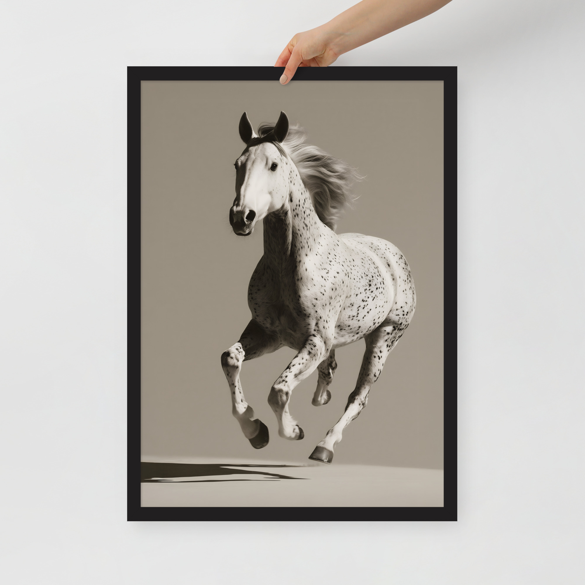 Galloping Horse framed print captures the kind of momentum you can feel in your own body. A horse, suspended mid stride, moves with clean intensity and effortless control, as if the next second already belongs to it.